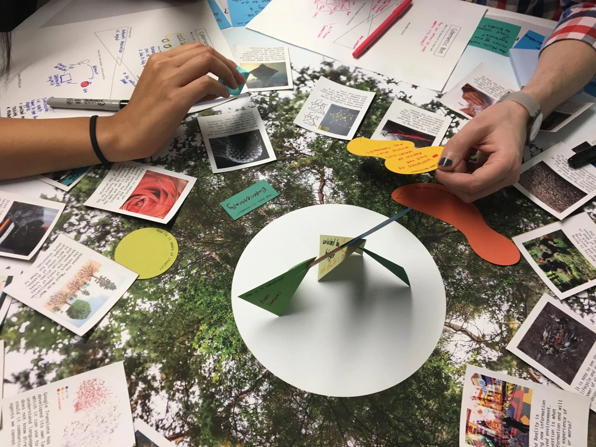 I began this project from a discussive space by designing a series of speculative probes meant to judge the current climate of imagination surrounding the idea of the nonhuman. I quickly found these probes pointed to a much more complex role of speculative designer. To do this I repurposed the characteristics of a social lab who’s home has typically been in the field of social innovation and bring it to the space of speculative design. The goal was to bring together various stakeholders to expand each other's considerations for the future of artificial intelligence particularly as it relates to ecology. I started with the questions, How might machines grant us new perception of the nonhuman? How might machines facilitate a more dynamic relationship with the nonhuman? I then let the vision grow organically, letting these original questions and signals guide our strategic vision. I launched the lab with a two day immersive workshop in which people explored the possibilities of intelligent machines interfacing with forests. Building on the success of the the immersive workshop I began to develop a “portfolio of engagements.” I streamlined the experience by adding elements of play, out of which came the Future Minds game and a work of design fiction I called the “documented imaginary.” I launched a website, started a newsletter, and begun to host a regular meet-up. In this way, a community has begun to form around an evolving vision of eco-cogontive AI.